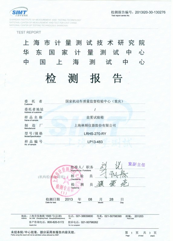 中国汽车工程研究院股份有限公司(股份代码:601965)始建于1965年,注册资金6.4亿,为国内最主要的汽车研发机构之一,并被科技部授予“国际科技合作基地”,日前,因试验室检测条件需要,在我司定购一台盐雾试验箱(型号LRHS-270-RY),经内部标准测试后再送入第三方计量并出具合格报告,此台产品将放置于国家机动车质量监督检验中心(重庆)检测使用。
